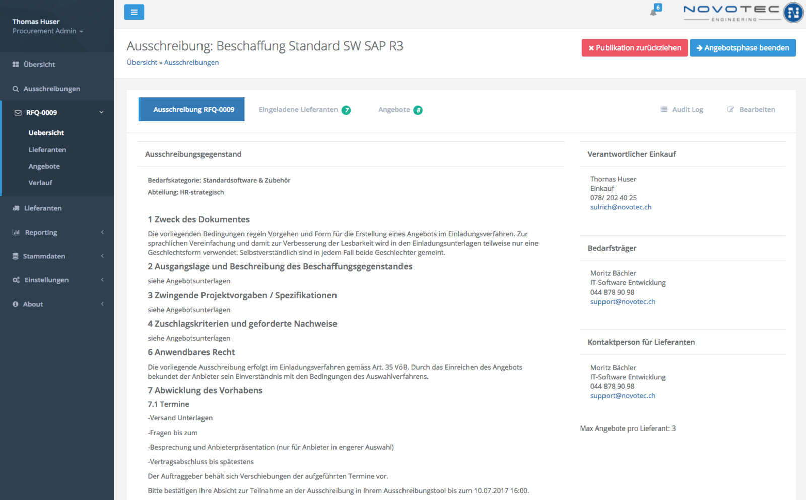 Optimieren Sie Ihren Einkauf mit der modernen e-Procurement-Lösung von Novotec. Mit e-Request erstellen Sie Ausschreibungen im Handumdrehen – unterstützt durch intelligente Vorlagen, flexible Bewertungskriterien und eine nahtlose Zusammenarbeit mit den Fachbereichen. Weniger Aufwand, mehr Transparenz und maximale Nachvollziehbarkeit